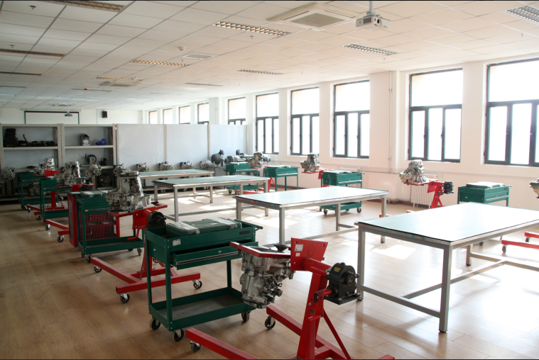 汽车底盘构造实训室建成于2012年10月,占地130平方米,主要设备有手动及自动变速器共10台、DSG双离合自动变速箱解剖台架、汽车气压及液压制动系实训台、电子及液压转向系台架、大众捷达及丰田卡罗拉悬架实训台等,同时配有各种世达拆装专用工具。主要实训的项目有:底盘维修工具、量具及仪器设备的使用;底盘部件结构认知、拆装、检测、维修。能够满足汽车检测与维修技术专业、汽车电子专业、汽车车身维修技术专业、汽车营销与服务专业的实训需求。通过该实训使学生理解汽车底盘各总成的结构及原理,能正确并熟练使用底盘维修工具和设备,掌握底盘的维修工艺,能进行常见机械故障诊断和排除,并养成良好的工作学习习惯。