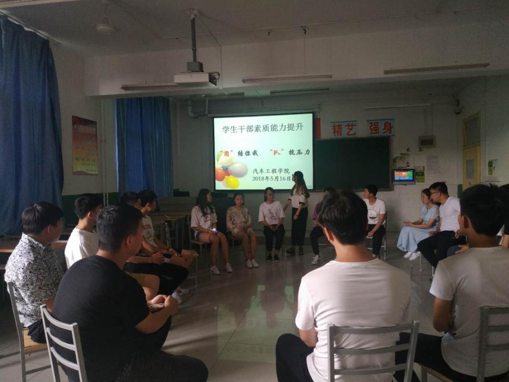 为加强学生干部队伍建设,提高学生干部的心理素质和工作能力,打造一支能出成绩、能抗压力的学生干部队伍,5月16日下午,汽车工程学院组织开展了以“团结你我,‘队’抗压力”为主题的学生干部专题培训。此次培训由陕中医心理学专业实习生项力尧主持。