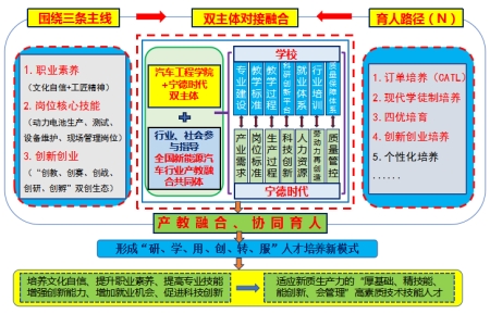 签订“宁德时代动力电池先进技术产业学院”协议, 共建新能源动力电池智造工程技术中心,根据真实岗位生产设备、环境,实现教学过程与生产过程零距离对接,强化汽车产业电池高端技术能力培养。依托实践基地,校企联合申报新能源汽车产教融合实践中心评为省级培育实践中心,签订"第二期供需对接就业育人项目校企合作协议",共同开展订单培养和现代学徒制人才培养,设立奖学金,近年来为宁德时代动力电池设备维护、生产、测试岗位输送就业人才300余人。