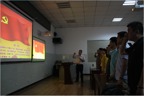在会上,全体教师党员首先观看了“时尚的传统”陕西工院专题介绍视频,然后进行了党章学习。在朱辉、鲁玺、许冀阳等老师的带领下,全体老师全本通读了党章第一章《党员》、第二章《党的组织制度》和第七章《党的纪律》,并在陈昊平同志带领下进行了党员宣誓。