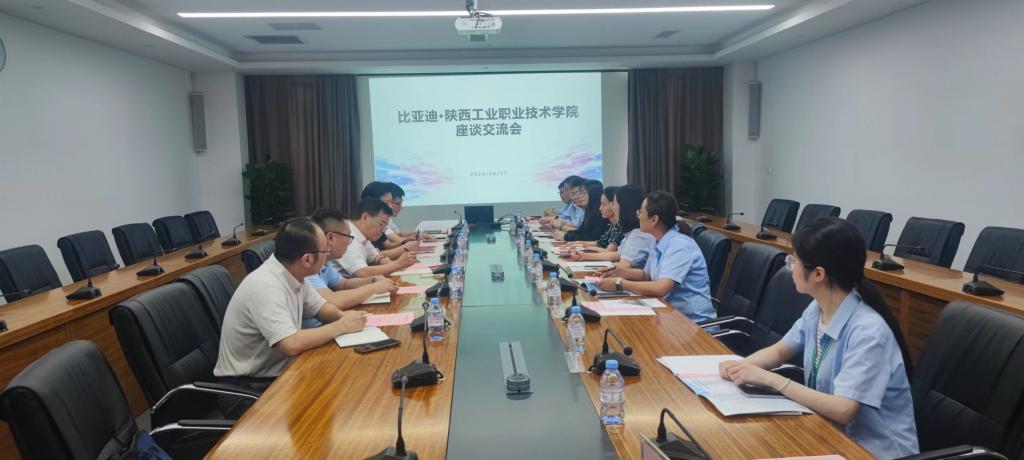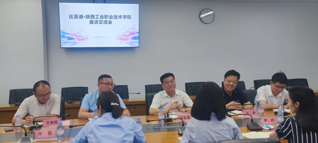 参观结束后,校长刘永亮一行与比亚迪西北地区人力资源总监晁蓉,校企合作高级经理李莉,比亚迪弗迪电池工厂办公室主任贺丽平等进行了深入座谈交流。校长刘永亮介绍了学校的基本情况、专业设置及人才培养特色,从双高建设、职教本科发展、专业对接产业升级等方面对校企合作、产教融合开展的重要意义进行了详细阐述,并表示此次调研对于推动学校与企业之间的深度合作具有重要意义。比亚迪西北人力资源总监晁蓉从新能源汽车技术方向、弗迪电池技术发展、企业高技能人才培养路径、校企合作培养模式等方面进行了介绍,并表示企业高度重视与学校的合作关系,希望携手共创校企合作新局面。