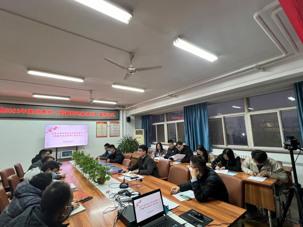 为进一步加强我院教师队伍师德师风建设,增强新进教师服务学生成长和促进学校高质量发展的使命感,12月27日下午,汽车工程学院党总支组织开展了师德师风教育活动暨2023年度新进教师《师德师风承诺书》签字仪式。仪式由汽车工程学院副院长(主持工作)许冀阳主持,汽车工程学院全体教师参加。