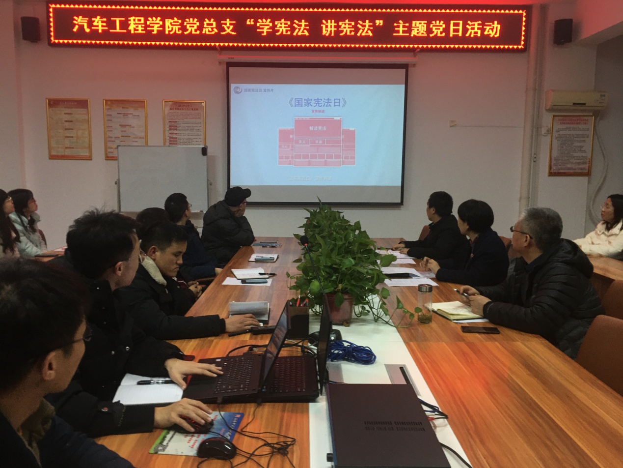 为了进一步树立广大党员的宪法意识,增强党员的法治观念,让宪法真正成为推动工作的重要精神动力。11月30日下午,汽车学院党总支开展“学宪法 讲宪法”主题党日活动。活动由总支书记高亚宁主持,汽车学院全体党员参加。