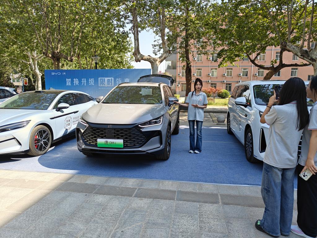 活动现场,五款车型整齐排列,吸引了众多学生驻足围观。比亚迪的内训师结合每款车的独特构造和核心卖点,深入浅出地讲述比亚迪的品牌发展历程、创新理念与文化内涵。从秦的亲民实用、以超高性价比成为家庭用车优选,到汉的豪华大气,凭借先进科技展现中国智造实力;从唐的宽敞空间与强劲动力,满足多元出行需求,到元的小巧灵动、贴合年轻消费者喜好,再到夏作为新成员展现出的创新设计与舒适驾乘体验,每一款车都承载着比亚迪对市场需求的精准把握和对技术的不懈追求。